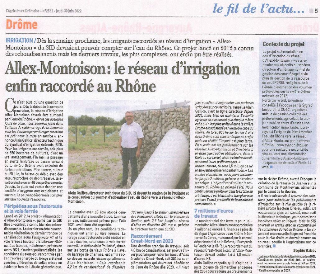 Porté par le SID, lui-même conseillé par le SYGRED (Organisme Unique de Gestion Collectif des prélèvements agricoles), le projet, qui a débuté en 2012, a subi en cours d’études une modification importante. Le projet prévoyait à l’origine de faire transiter l’eau du Rhône vers le réseau d’Allex-Montoison par le réseau d’Etoile-Livron avant d’évoluer, pour une meilleure sécurité du réseau, vers une alimentation du territoire d’Allex-Montoison indépendante de celle d’Etoile-Livron.